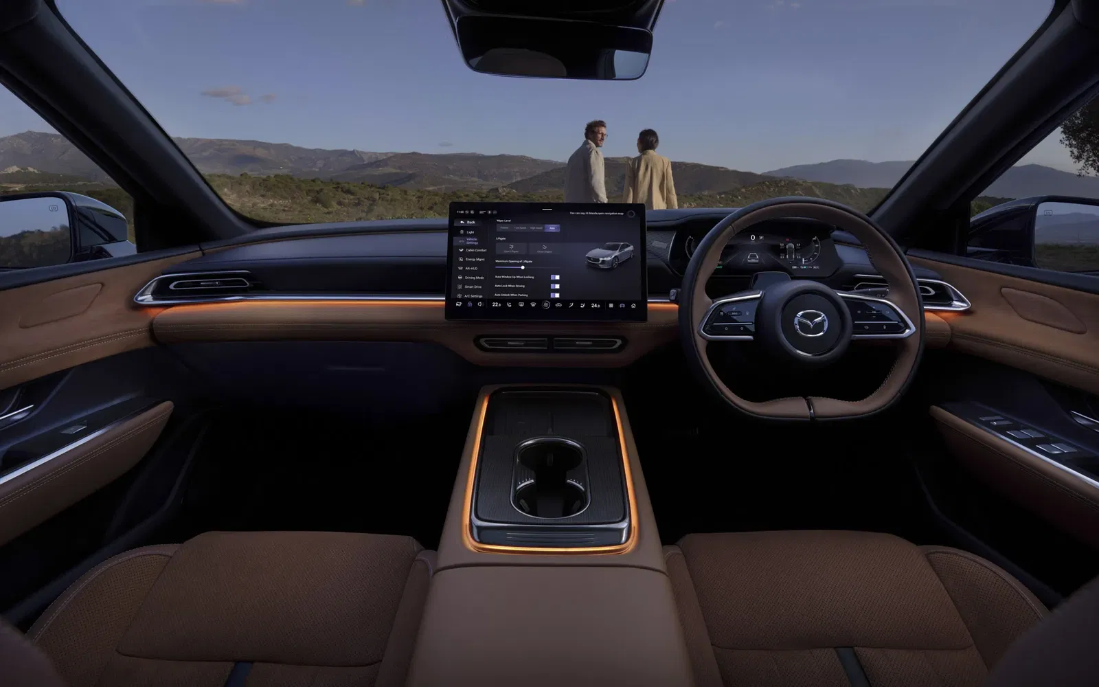 Inside, the cabin moves away from traditional Mazda layouts to a minimalist design, dominated by a 14.6-inch central touchscreen and a 10.2-inch driver display.