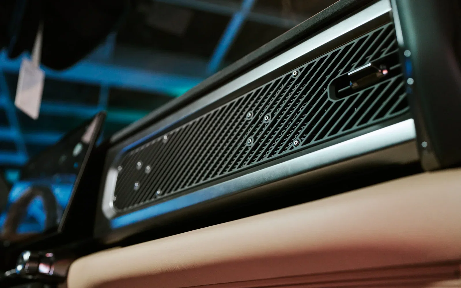 The passenger side of the dashboard features a prominent grab handle alongside a textured trim panel secured by exposed hex bolts, lending an industrial look to the cabin.