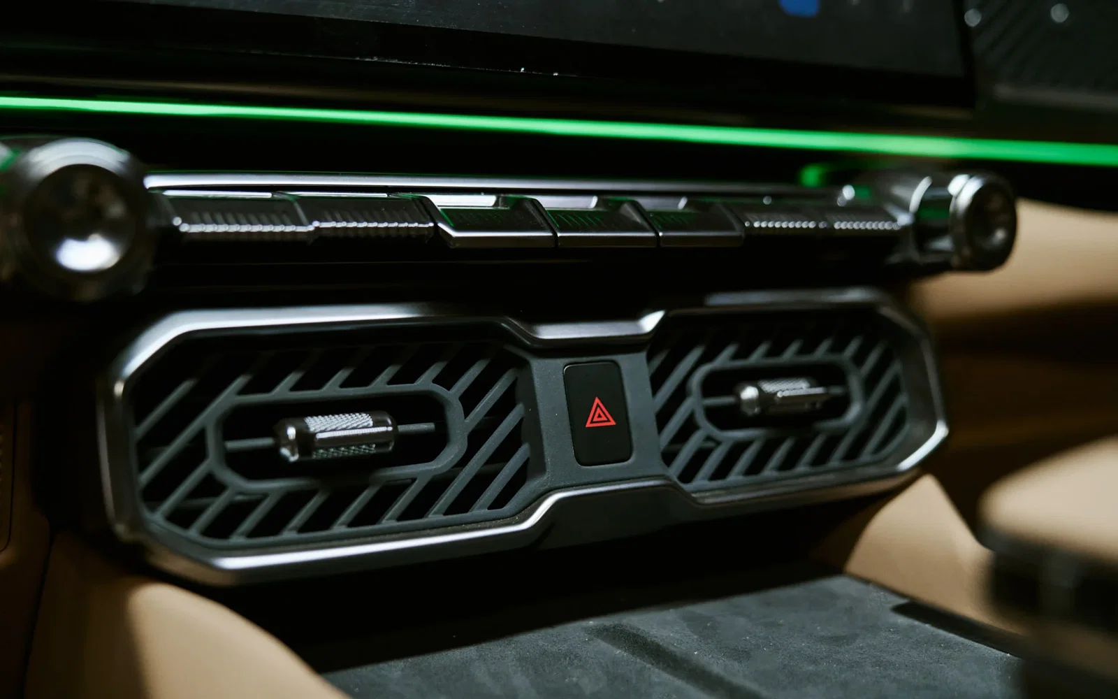 An ambient lighting strip runs across the dash and into the door panels.