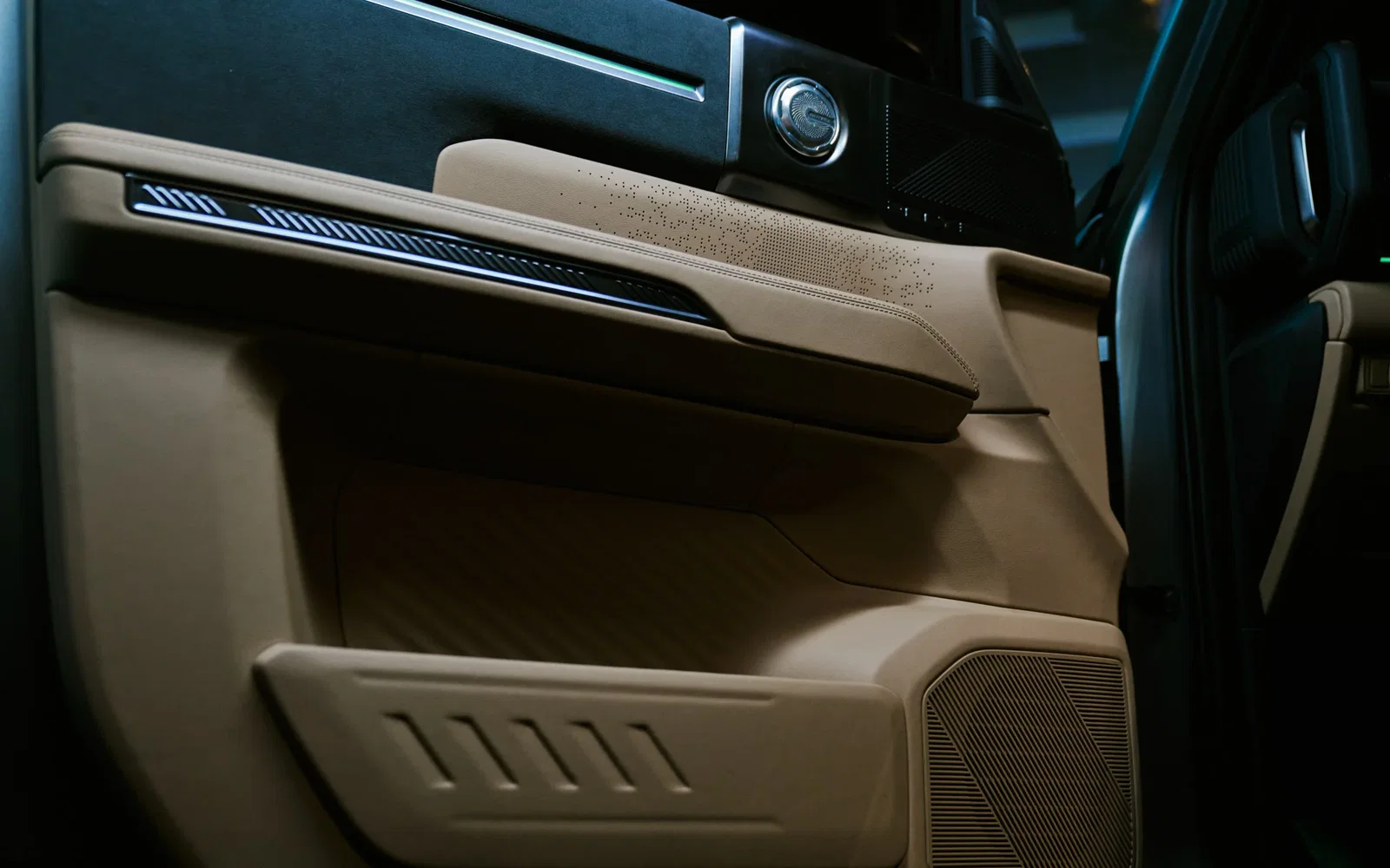 This lighter lower section is contrasted by a dark, suede-like material covering the upper dashboard and door trims.