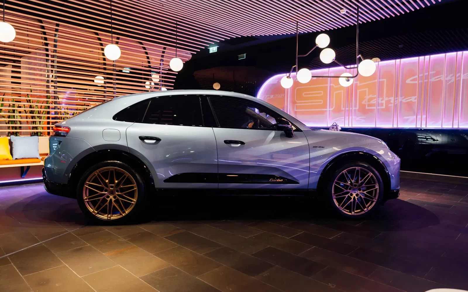 The showcase includes vehicles such as the new electric Macan, a Paint-to-Sample 911 Carrera GTS, and a selection of classic Porsche models.