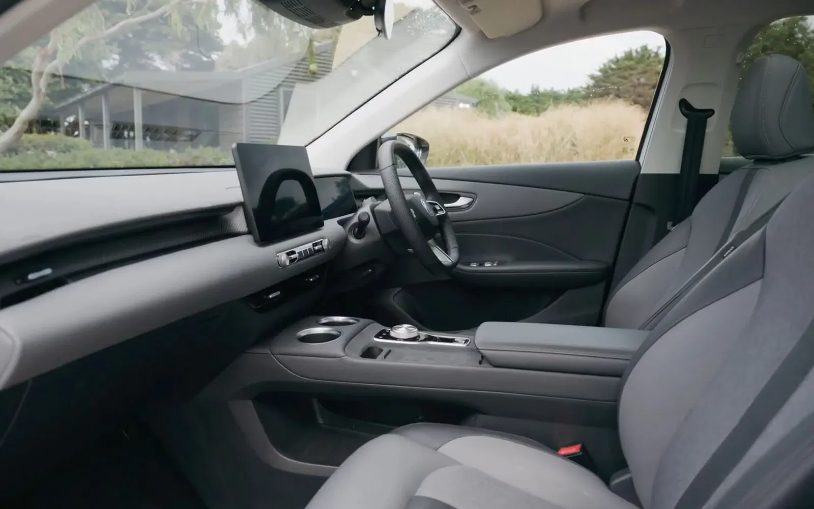 At first glance, the front cabin of the S5 EV is great. MG has clearly listened to feedback, offering a clean, simple layout highlighted by physical, metallic-feeling climate control buttons instead of burying them deep within a touchscreen. The use of soft-touch materials and Alcantara on the centre console makes the space feel a lot nicer than what you might expect at this price point. Ergonomically, it just works.
